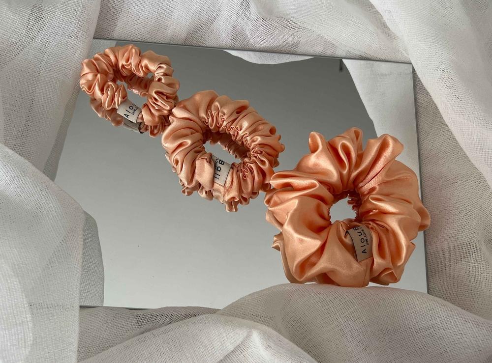 These light orange color scrunchies give your hair a chic and safe hold. The Classic size offers a classic, go-to option, while the Petite size is ideal for delicate ponytails or subtle half-up styles. The Grand size guarantees that your hairstyle stands out elegantly for those special occasions or when you want to make a statement.